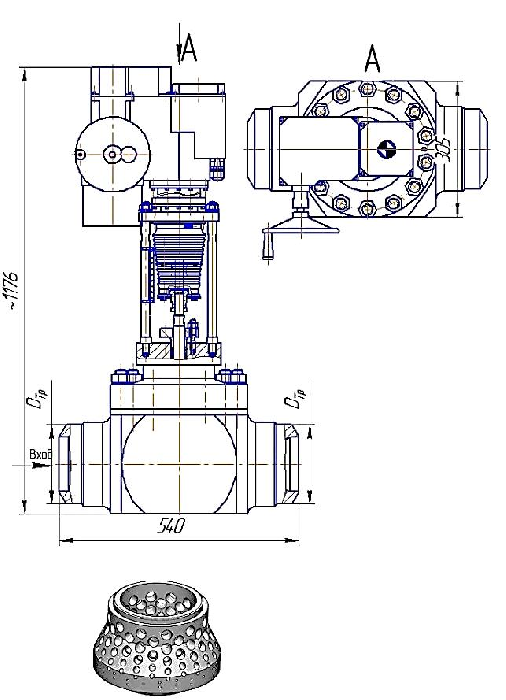 Особенности конструкции: клапан имеет сменные элементы проточной части, затвор клеточного типа с разгруженным плунжером (золотником), три ступени снижения давления. Встроенный электропривод типа МЭП. Ремонт производится без демонтажа клапана из трубопровода путем замены затвора («клетка – плунжер», уплотнительные элементы). Расчётный срок эксплуатации – 200 тыс. часов.